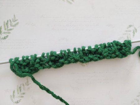 3 ряд – кром. (3 ип. 4 петли (1лп, протяжка, 1 лп, протяжка) провязываем вместе за заднюю стенку петель, но не скидываем. Затем сразу же провязываем за переднюю стенку. Теперь скидываем) – повторяем весь ряд. Кром.