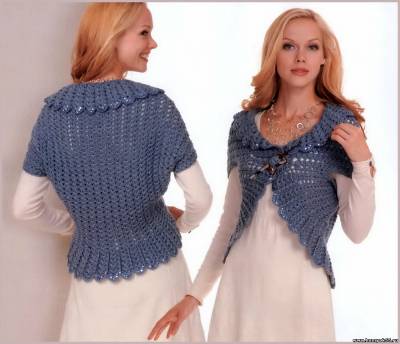 Это стильное и модное болеро-безрукавка отлично будет смотреться на худеньких девушках. Схема вязания крючком бесплатно.