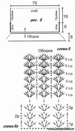 Свяжите прямоугольное полотно узором по схеме 8, выполняя по 3 ВП подъема в начале каждого ряда. Размеры изделия и направление вязания смотрите на рисунке 8. Готовое полотно сложите пополам и соедините по бокам вдоль отрезков длиной 9 см, оставив отверстия для пройм размером 16 см.