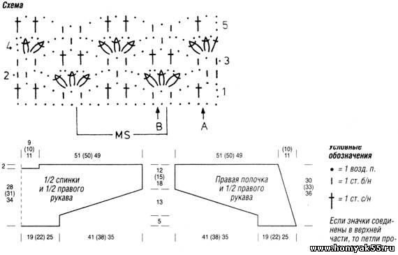 Связать цепочку из 31 (36) 41 ВП + 3 ВП подъема и вязать кружевным узором, начиная с петель от стрелки А (В) А. Для скоса выреза убавить на протяжении следующих 30 (33) 36 см с правой стороны 9 (10) 11 см. Одновременно выполнить с левой стороны прибавления для рукава, как на спинке. Закончить через 30 (33) 36 см от наборного края.