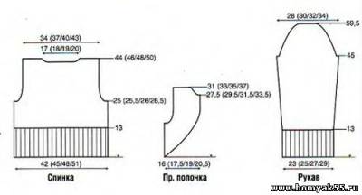 На спицы № 4 набрать 2 петли и вязать лиц. гладью, прибавить с правой стороны работы в каждом 2-м ряду 8 (9, 10, 11) раз по 2 петли, 11 (13, 15, 17) раз по 1 петле, в каждом 4-м ряду 3 раза по 1 петле, через 6 рядов - 1 петлю, через 10 рядов - 1 петлю. Одновременно, на высоте 12 (12,5; 13; 13,5) см для формирования проймы закрыть с левой стороны по 2 петли, затем убавить на 2-х кром. петлях в каждом 4-м ряду 3 раза по 2 петли.На высоте 27,5 (29,5; 31,5; 32,5) см для формирования выреза горловины закрыть с правой стороны работы 2 (3, 3, 4) петли, затем в каждом 2-м ряду 3 раза по 2 (2, 3, 3) петли и 1 раз по 1 (2, 1, 2) петле. На высоте 31 (33, 35, 37) см закрыть оставшиеся 17 (19, 21, 23) петли.