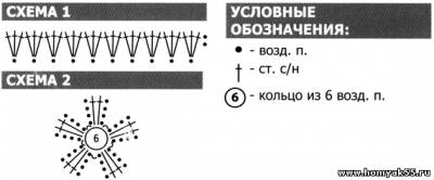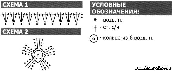 Наберите 6 ВП, замкните в кольцо. В центр кольца ввяжите 12 ССН. Далее вяжите круг диаметром 12 см, равномерно прибавляя в каждом ряду по 12 ССН. Затем вяжите без прибавлений до нужной глубины шапочки. Край шапочки обвяжите следующим образом: желтой нитью свяжите 1 СБН, * затем свяжите цепочку из 12 ВП, на этой цепочке свяжите спиральку по схеме 1, прикрепите к краю шапочки и провяжите 3 СБН *, повторяйте *-*. Свяжите цветочки по схеме 2, наденьте их на спиральки и закрепите.