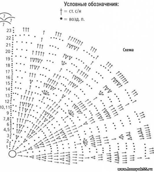 Наберите цепочку из 10 ВП, замкните в кольцо. В центр кольца ввяжите 21 ССН. Далее вяжите по схеме. После этого вяжите СБН, выполняя равномерно убавления в каждом ряду (5 петель, 7 петель, 10 петель) до необходимого размера обхвата головы.Затем провяжите 3-5 рядов без убавлений. Края берета обвяжите бирюзовой нитью СБН с «пико».