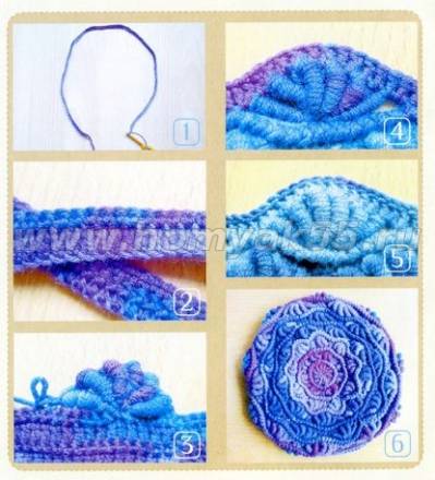 Далее начинайте выполнять убавления. Для этого в 13-м ряду вяжите ракушки из 5 столбиков по 10 витков. 14-й - 15-й ряды: ракушки из 4 столбиков по 10 витков. 16-й ряд: ракушки из 3 столбиков по 7 витков. 17-й ряд: ракушки из 2 столбиков по 6 витков. 18-й ряд: это кружочек в середине из 12 столбиков по 5 витков. Эти столбики не довязывайте до конца, а потом провязывайте вместе или соедините при помощи нити и иголки. Обвяжите берет «рачьим шагом» через петлю.