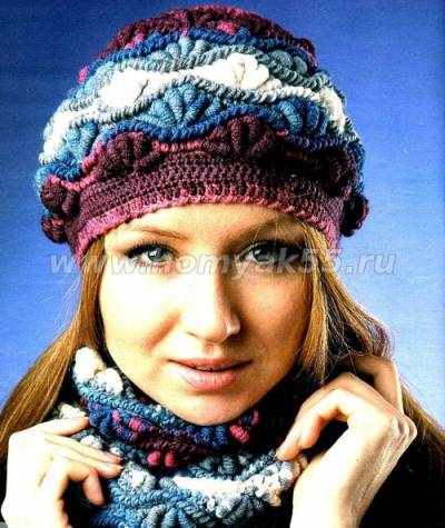 Очень красивый и яркий берет вяжется крючком необычным узором из витых столбиков