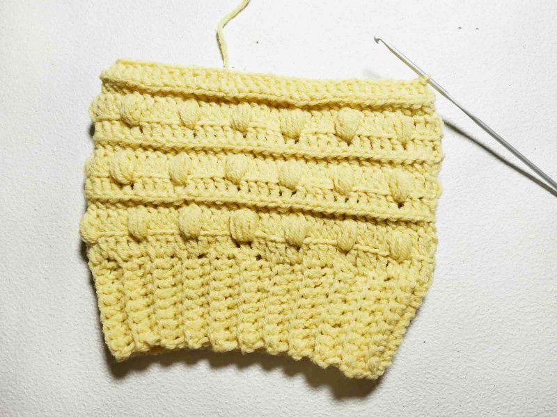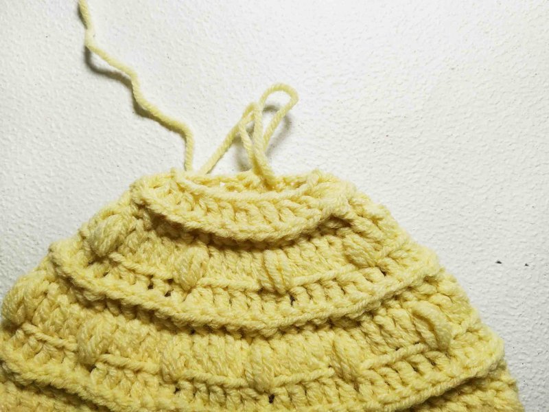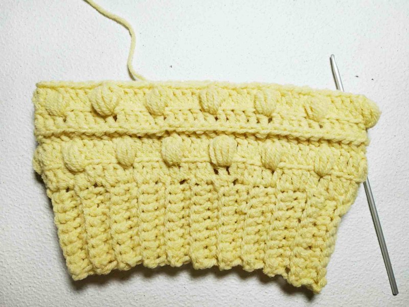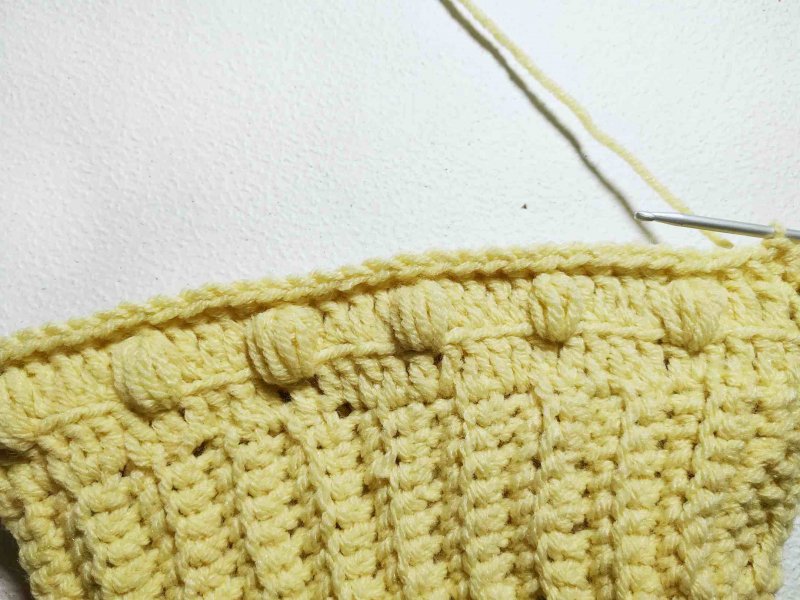 Далее провязать пышных столбиков точно так же, как и ранее. Затем связать ряд выпуклых столб. без нак, убавляя через каждые 4 петли.