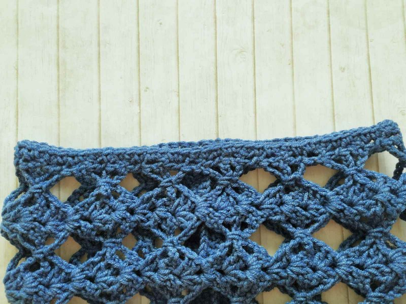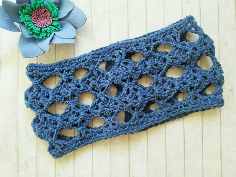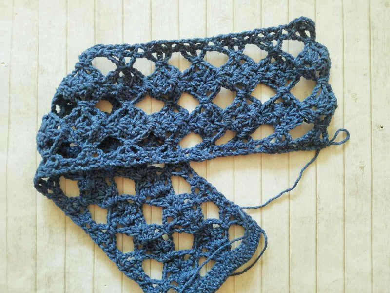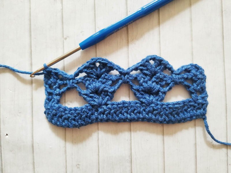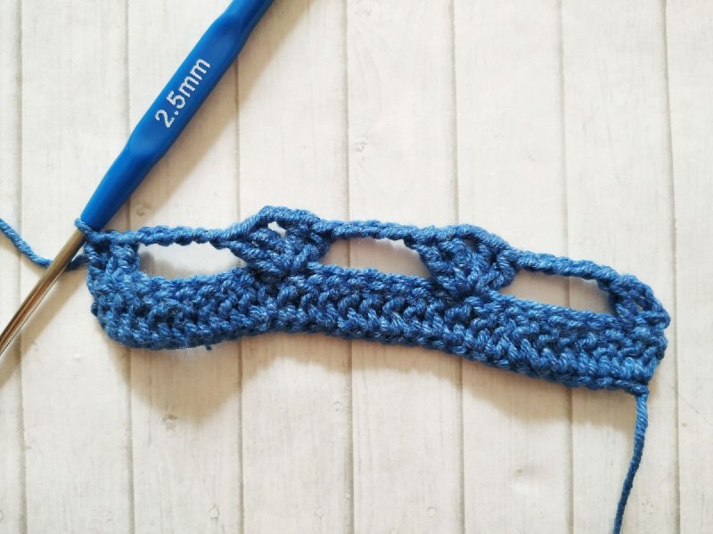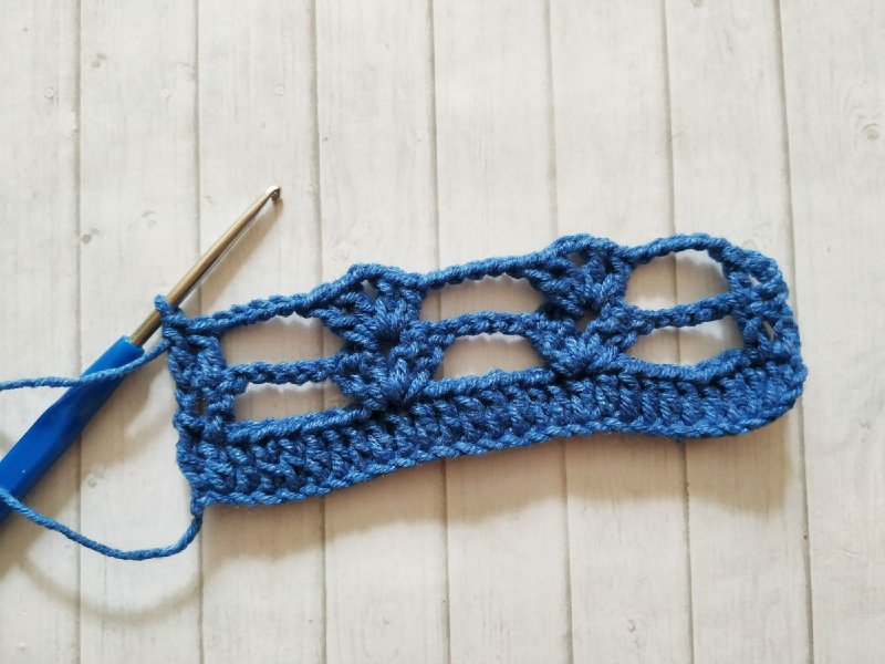 Далее повторяем 2 ряд дважды. А далее снова 3 ряд. Так будем вязать до нужной длины повязки. Длина зависит от обхвата головы. Чтобы конец изделия был таким же, как и начало, провяжем ряд ссн.