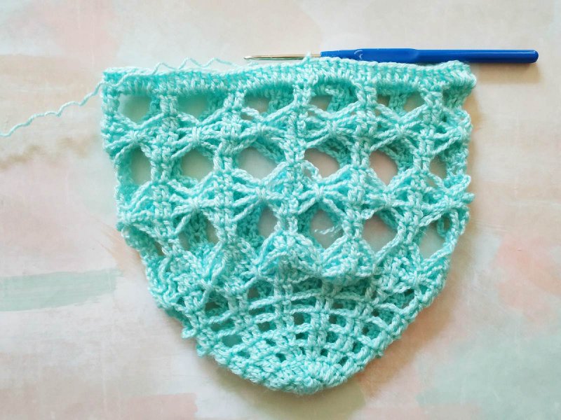 В следующем ряду вяжем ст\с\накидом в ст\с\накидом. Но теперь там, где 1 воздушная петля, делаем 2 петли.