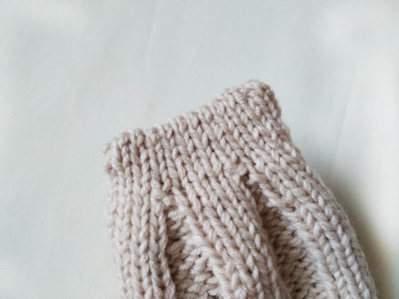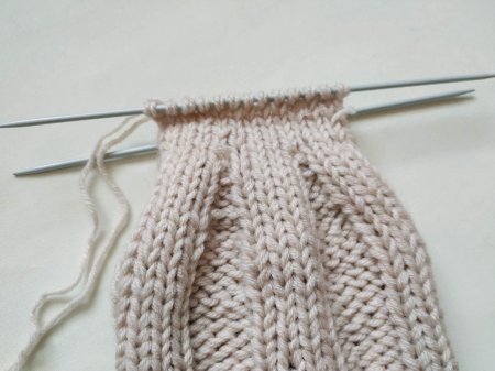 Раппорт данного узора в высоту всего 1 ряд. Это значит, что далее до нужно высоту шапки будем просто повторять ряд. То есть, вязать 4 лицевых и 4 изнаночных петель. По сути это резинка 4 на 4. По мере вязания полотно будет увеличивать в длину. В ширину же оно будет, наоборот, собираться. Это нормально для данного узора. Вся красота такой шапочки видна в растянутом виде.