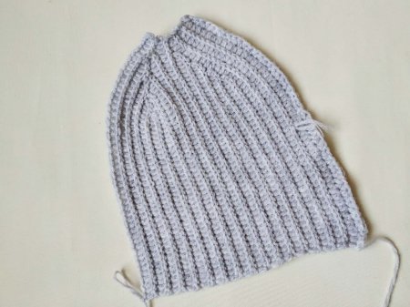 Вяжем до тех пор, пока шапка не будет подходить по обхвату головы. Макушку стягиваем, пропустив нитку между петлями. Выворачиваем заготовку на изнанку и сшиваем этой же нитью. Выворачиваем шапку и делаем отворот, если нужно.