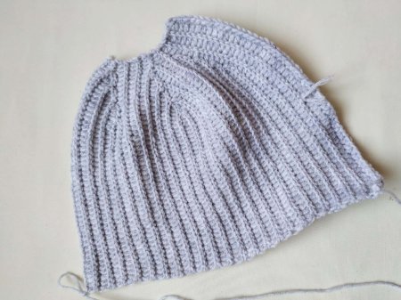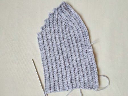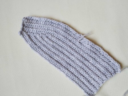 И дальше будем просто повторять эти 2 ряда – ряд пссн за заднюю полупетлю и ряд сс за заднюю полупетлю, при котором довязываем еще 3 петли по оставленным.