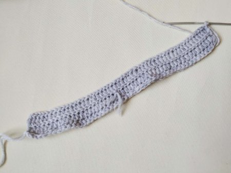 Далее вяжем 4 ряда таким образом: 1 ряд пссн в каждую петлю, затем 1 ряд сс в каждую петлю. Эти 2 ряда повторить. Затем свяжем еще раз пссн. Вяжем только за заднюю стенку петель.