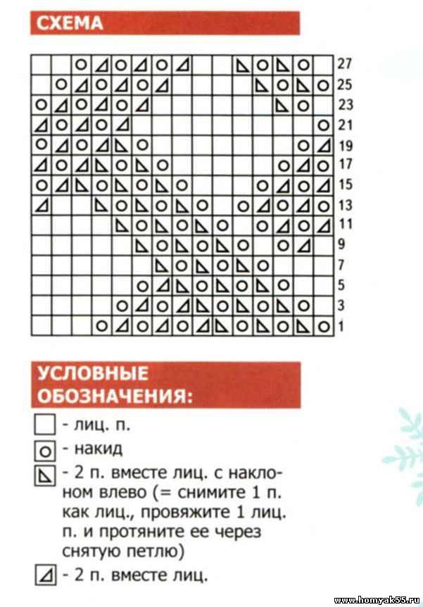 Ажурный узор: вяжите по схеме, на которой приведены только лиц. ряды, в изн. рядах все петли и накиды провязывайте изн.