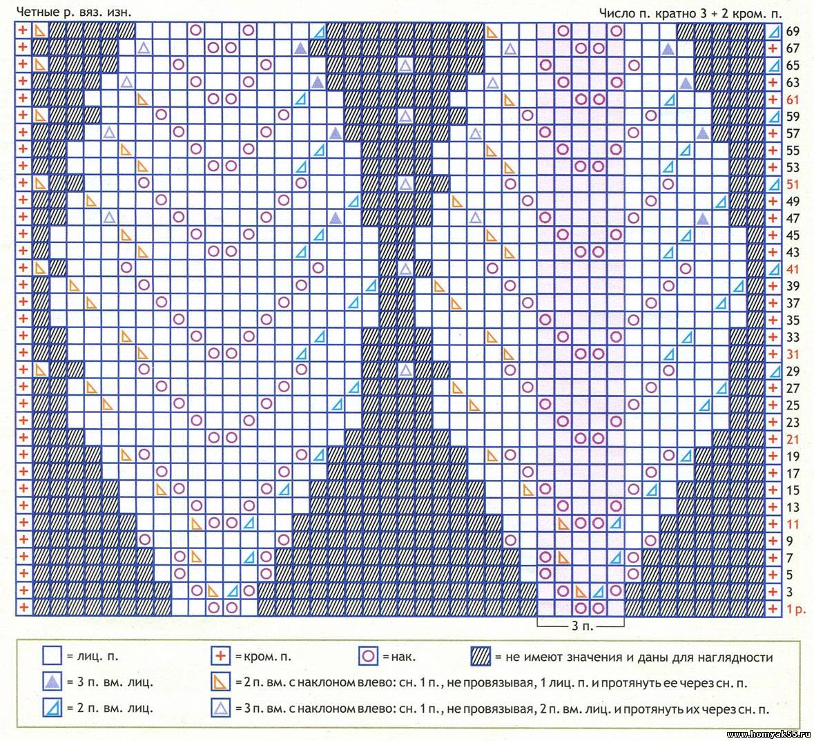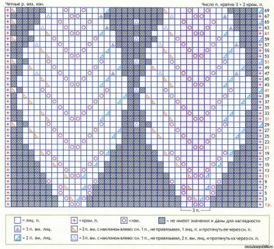 3-й ряд: 2 изн. петли, * прибавить 1 петлю из протяжки и провязать изн., 2 изн. петли *, повторить *-* до конца ряда = 29 петель. Продолжить узором по схеме, образуя 9 раппортов. Закончив 70-й ряд схемы, продолжить спицами № 3,5 резинкой 1 x 1. Через 7 рядов закрыть петли по рисунку.