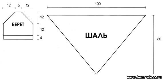 Вам потребуется: пряжа 300 г для шали и 150 г для берета тёмно-розовой пряжи Mondial Ciniglla (100% микрофибры. 41 м/50 г), прямые спицы № 7 и № 10.