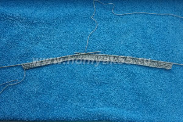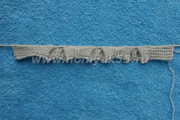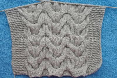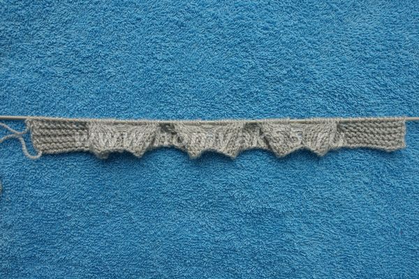 18 ряд – 1 кромочная, 10 лицевых за переднюю стенку, * 12 изнаночных, 1 лицевая, * повторить от (*) 4 раза, 12 изнаночных, 10 лицевых за переднюю стенку, 1 кромочная. Повторяем ряды 6 раз.
