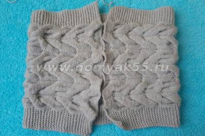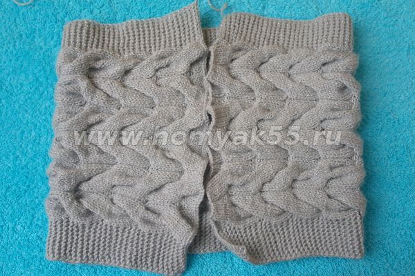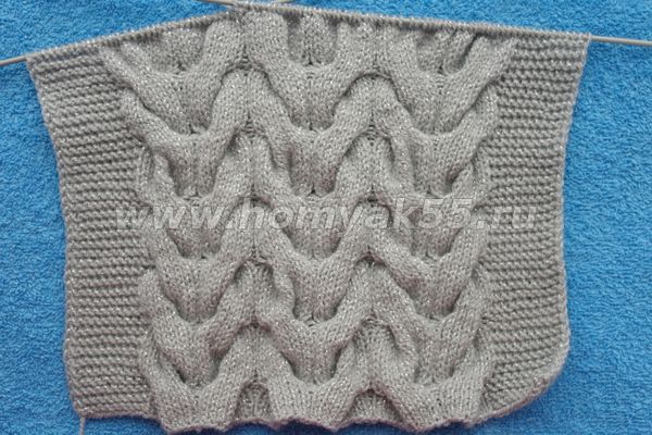 15 ряд – 1 кромочная, 10 лицевых за переднюю стенку, * 6 лицевых снять на дополнительную спицу за работой, провязать 6 лицевых за заднюю стенку и провязать 6 лицевых за заднюю стенку с дополнительной спицы, 1 изнаночная, 6 лицевых снять на дополнительную спицу перед работой, провязать 6 лицевых за заднюю стенку и провязать 6 лицевых за заднюю стенку с дополнительной спицы, 1 изнаночная * повторить от (*) еще 2 раза, 10 лицевых за переднюю стенку, 1 кромочная.