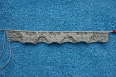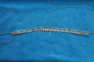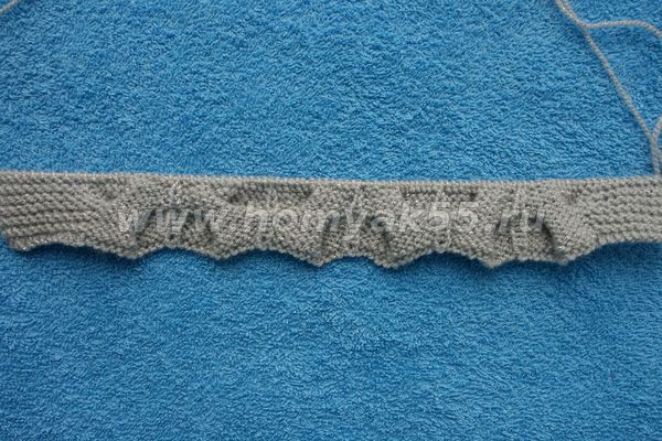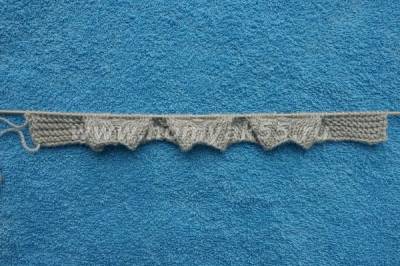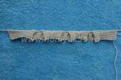 2 ряд – 1 кромочная, 10 лицевых за переднюю стенку, * 12 изнаночных, 1 лицевая, * повторить от (*) 4 раза, 12 изнаночных, 10 лицевых за переднюю стенку, 1 кромочная. Повторяем ряды 6 раз.