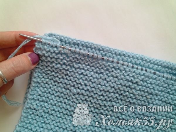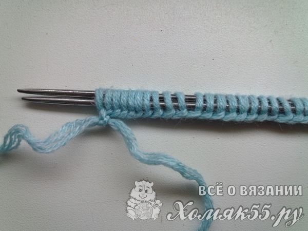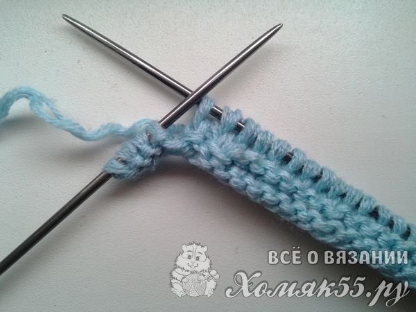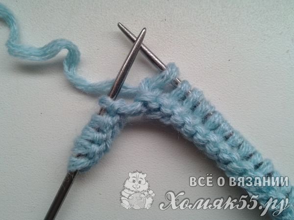 Теперь после того как мы набрали нужное число петель, можно приступать к вязанию. Обычно шапочки вяжутся либо сверху вниз, либо снизу вверх. Эта же шапка вяжется поперечными рядами, сбоку. То есть мы будем набирать вязанием рядов не высоту шапки, а ее ширину. Вяжем первый ряд лицевыми петлями. Первую всегда будем снимать. Нам нужно провязать не все петельки. Последние пять петель на спице мы вообще не трогаем.