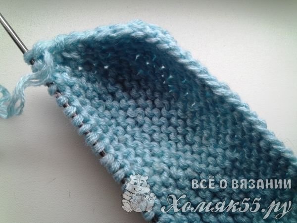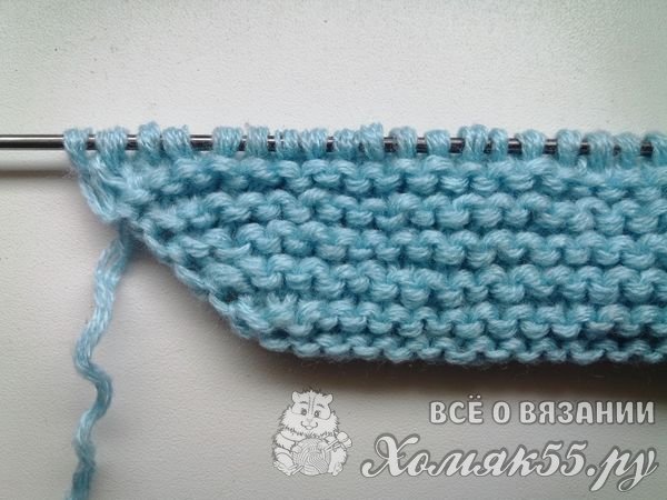 А просто разворачиваемся и вяжем в обратную сторону теми же лицевыми петлями. Все ряды будем вязать ими, то есть платочной вязкой. Закончили ряд и опять развернулись. Вяжем новый ряд. И его мы тоже не довяжем. Но теперь оставляем непровязанными не пять, а четыре петельки.