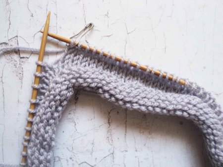 Далее нам необходимо провязать 5 рядов изнаночными петельками. Начало ряда лучше пометить, чтобы не потерять его в процессе вязания. Провязав 5 рядов изнаночными петлями, получится вот такое начало будущей повязки.