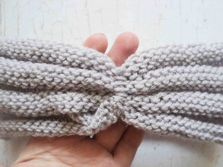 Нитку оставляем подлиннее и затем ею стягиваем середину повязки. Для этого при помощи иголки с толстым ушком (лучше для этого использовать пластиковую иглу) протягиваем нитку через вязание и подтягиваем ее. Делаем крепкий узелок. И прячем кончик нитки внутри вязания, а лишнее обрезаем.