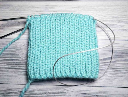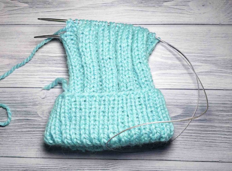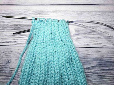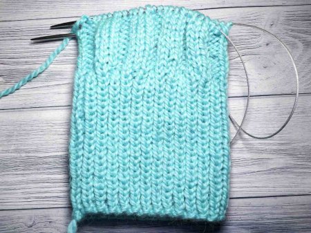 Дальше вяжем по кругу спицами № 4. Вяжем резинку 1 на 1 такой высоты, чтобы ее хватило на подворот.