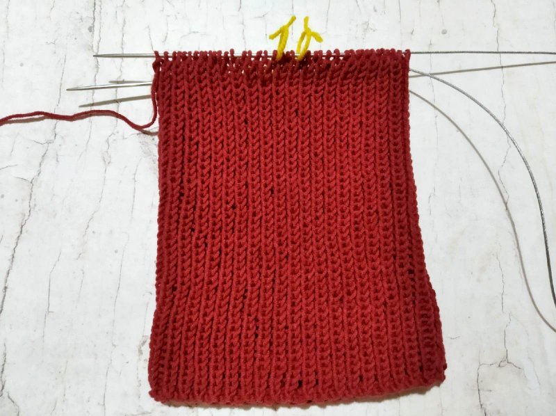 Теперь в каждой из этих частей нам нужно выделить по 3 центральные петли. И идти они должны в таком порядке: лицевая, изнаночная, лицевая. Ставим маркеры, выделяя так эти 3 петли спереди и сзади.