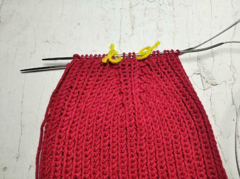 Поставив маркеры, начинаем вязать ряды с убавками.
