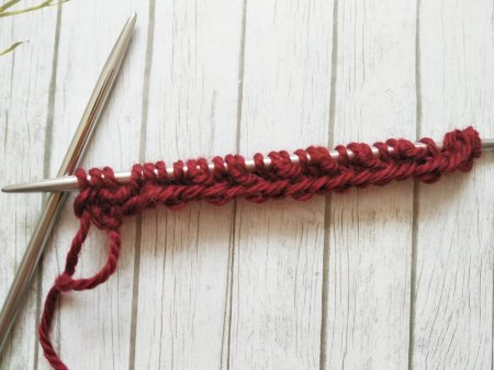 Теперь перейдем к вязанию центральной части повязки, она будет узкой и плотной. Вяжется она просто. Двойную петлю провязываем, как обычно 1 лицевой, а каждую изнаночную просто снимаем, но уже без накида. При этом рабочую нить прокладываем перед работой.