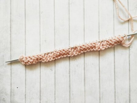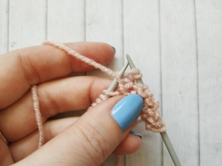 Затем провязываем лицевую с 2 витками еще 2 раза. А потом снова 5 простых изнаночных петель. И снова 3 лицевые с 2 витками.