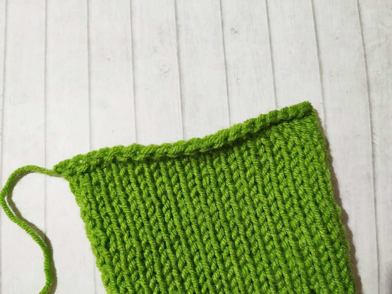 Теперь закрываем петли любым удобным способом. Самый простой способ - снять кромочную, затем поместить нить перед работой, кромочную вернуть, провязать 2 петли вместе изнаночной. Нить перед работой, вернуть петлю. И так продолжать до самого конца, пока не закончатся петли. В конце закрепить нить и обрезать, оставив хвостик.