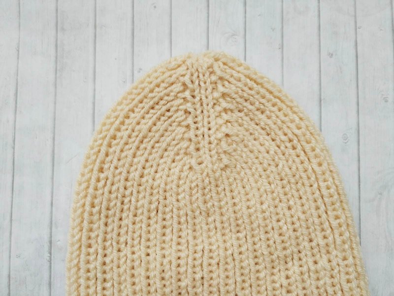 Вся шапка вяжется резинкой 1 на 1. То есть в каждом новом ряду мы будем чередовать 1 лицевую петлю с 1 изнаночной.
