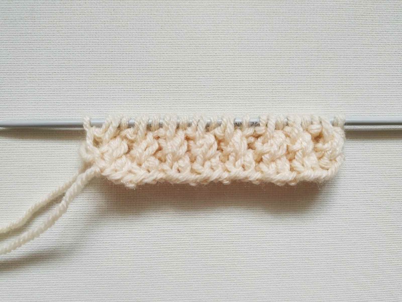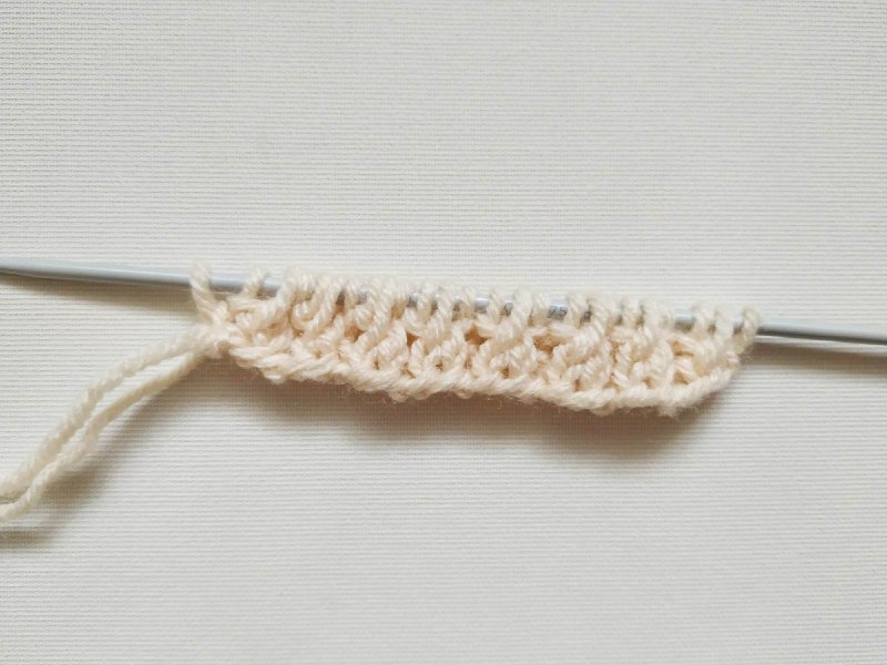 И снова повторяем рисунок с изнаночного ряда, где идет чередование двух изнаночных петель с одной лицевой. Дальше вяжем ряд лицевой.