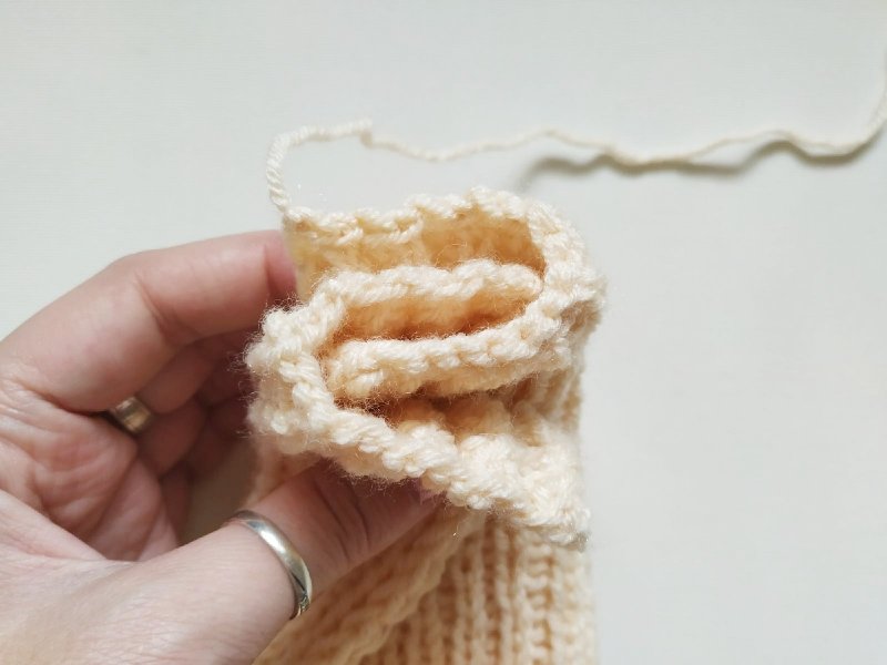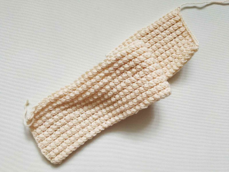 Так будем чередовать эти два рядочка, пока не наберем шарфик длиной равной обхвату головы. После этого петли закроем, оставив кончик пряжи для сшивания.