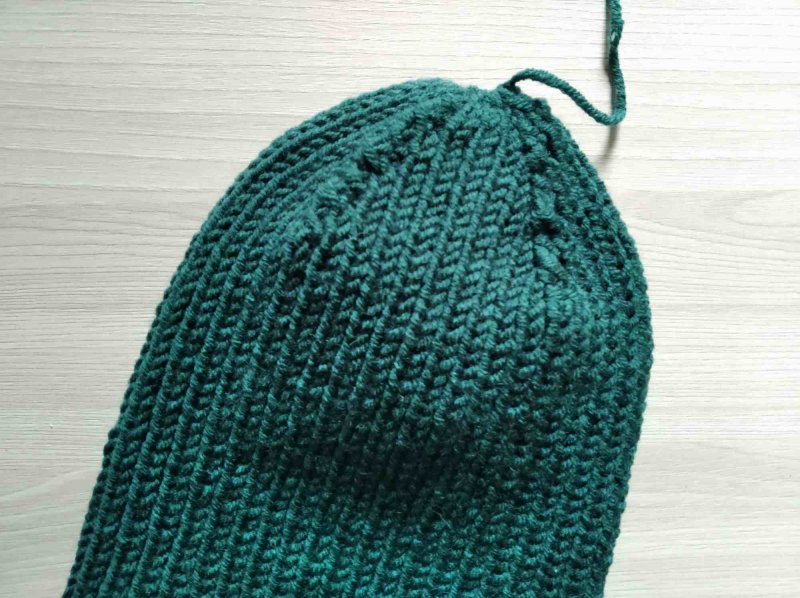 И будем повторять эти 4 ряда, пока не останется совсем мало петелек. Провяжем их по 2 вместе лицевой и стянем оставшиеся петли ниткой. Сделаем пару узелков, чтобы вязание не распустилось.