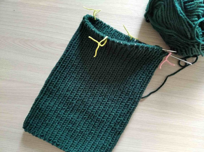 Так вяжем, пока не наберется высота примерно 25 см. И поделим полотно на 4 равные части. Но нужно сделать так, чтобы после каждого маркера шла лицевая петля.