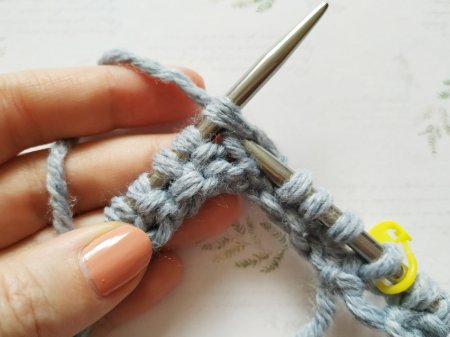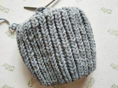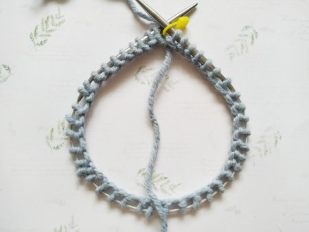 Дальше будем закрывать отверстие. Для этого провяжем ряд просто резинкой 1/1. Затем вяжем по 2 петли вместе лицевой.