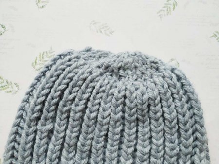 Затем просто провязываем по 2 лицевые вместе, оставшиеся петли собираем на нить. Затягиваем отверстие и прячем нить на изнаночной стороне шапки.