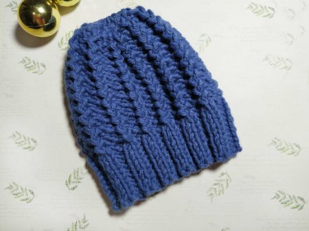 затем провяжем ряд, выполняя по 2 петли вместе лиц. Оставшиеся петлю стянем и этой же ниткой сошьем шапку.