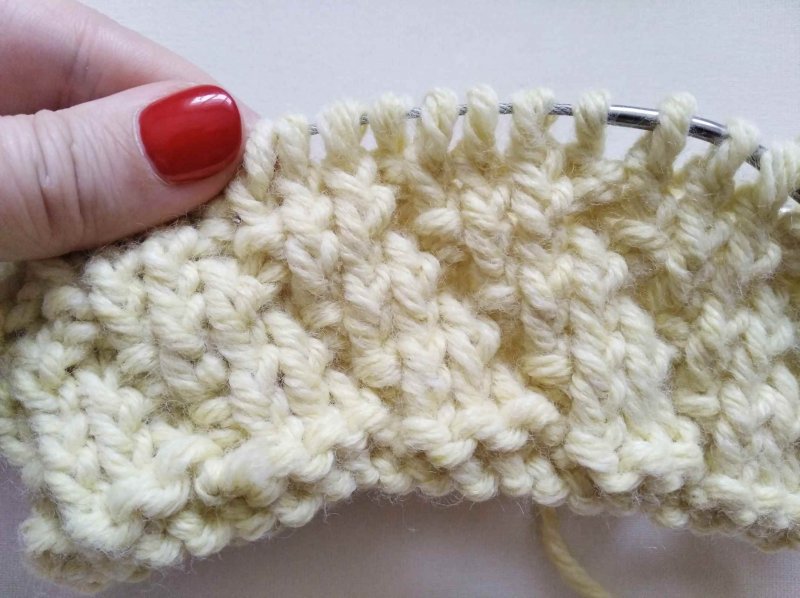 5 ряд: провяжите 1 лицевую петлю. Далее чередуйте 1 изнаночную и 3 лицевых. Если все правильно провязали, то ряд закончится 2 лицевыми.