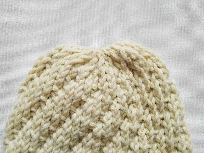 Теперь перейдите полностью на лицевую гладь. И вяжите 1 лицевую и 2 вместе лицевой петелькой. В следующем ряду делать убавки не надо. Затем необходимо еще раз повторить ряд с убавлениями. И чтобы петель осталось совсем мало, провяжите 1-2 ряда по 2 петли вместе лицевой.
