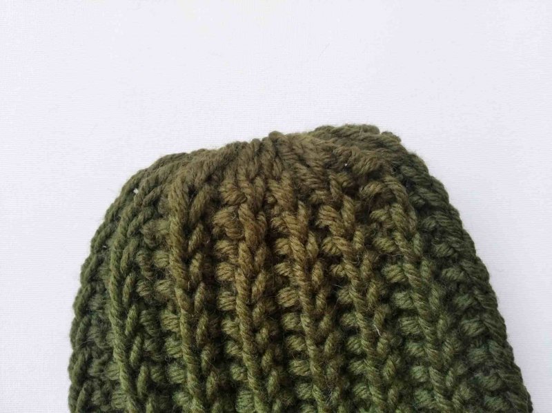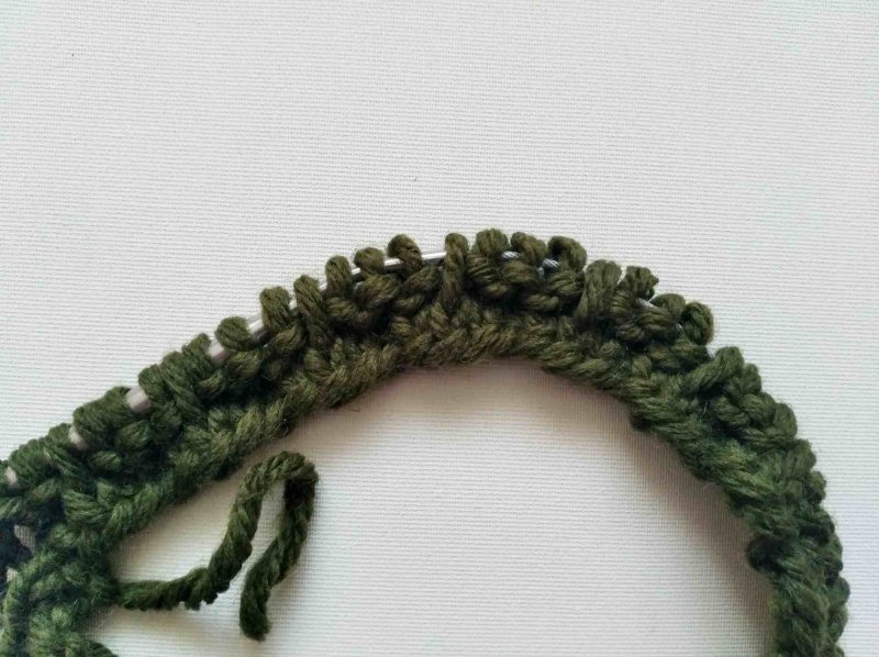 Закрепляем нить и обрезаем ее. Также заправляем хвостик от наборного края шапки внутри вязания с изнаночной стороны.