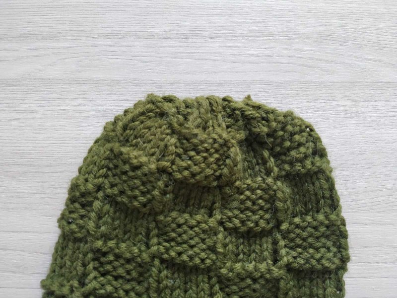 Затем провязываем вместе каждую 1 и 2 петлю из 3 петель, оставшихся от квадратиков. И вяжем ряд без убавлений. Затем по 2 петли вместе лицевой. Стягиваем отверстие и прячем нить на изнаночной стороне шапки.