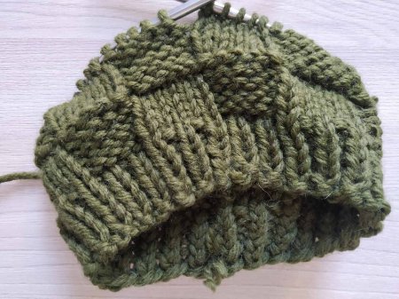 И снова меняем узор, провязывая в лиц. петли изн. и наоборот. Таким образом вяжем до нужной высоты шапки. То есть по 4 ряда по рисунку, а затем меняем его.