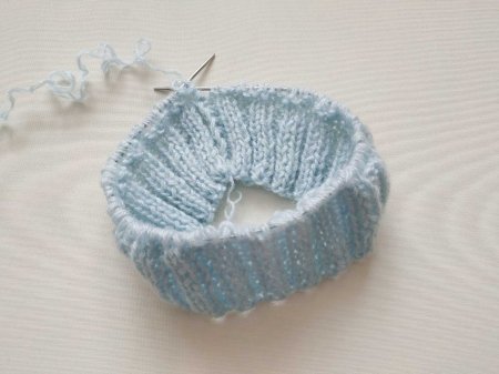 Замыкаем вязания в кольцо и далее вяжем резинку. Вяжем любую, какая больше нравится. В данном случае это резинка 2 лп на 2 ип.