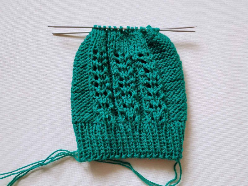 Теперь убавлять через каждые 7 петель. Провязать ряд без убавлений. Затем вязать с убавкой через 6 петель. Выполнить ряд без убавлений. Постепенно по центру останутся только лицевые петли.