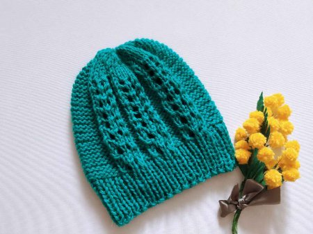 Для такой шапки нужно набрать количество петель кратное 9. Затем замкнуть вязание в круг и выполнить несколько рядов резинкой, чередуя лицевую и изнаночную петли.
