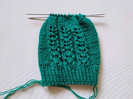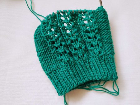 Затем убавлять. Сначала связать убавки через каждые 8 петель. Затем провязать ряд по узору. Центральные элементы больше не провязывать. Уменьшать, провязывая всегда лицевыми. По бокам от узора вязать изнаночными петлями.