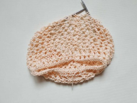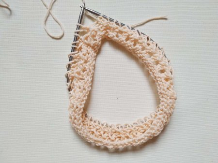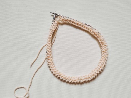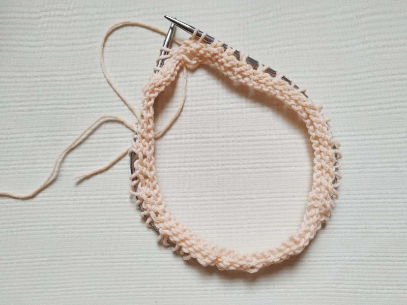Для такого берета набираем нужное для обхвата головы количество петель и замыкаем петли в круг. Раппорт узора всего 4 ряда в высоту. Но сначала провяжем 5 рядов изнаночными петлями. Это будет своего рода небольшая резинка.